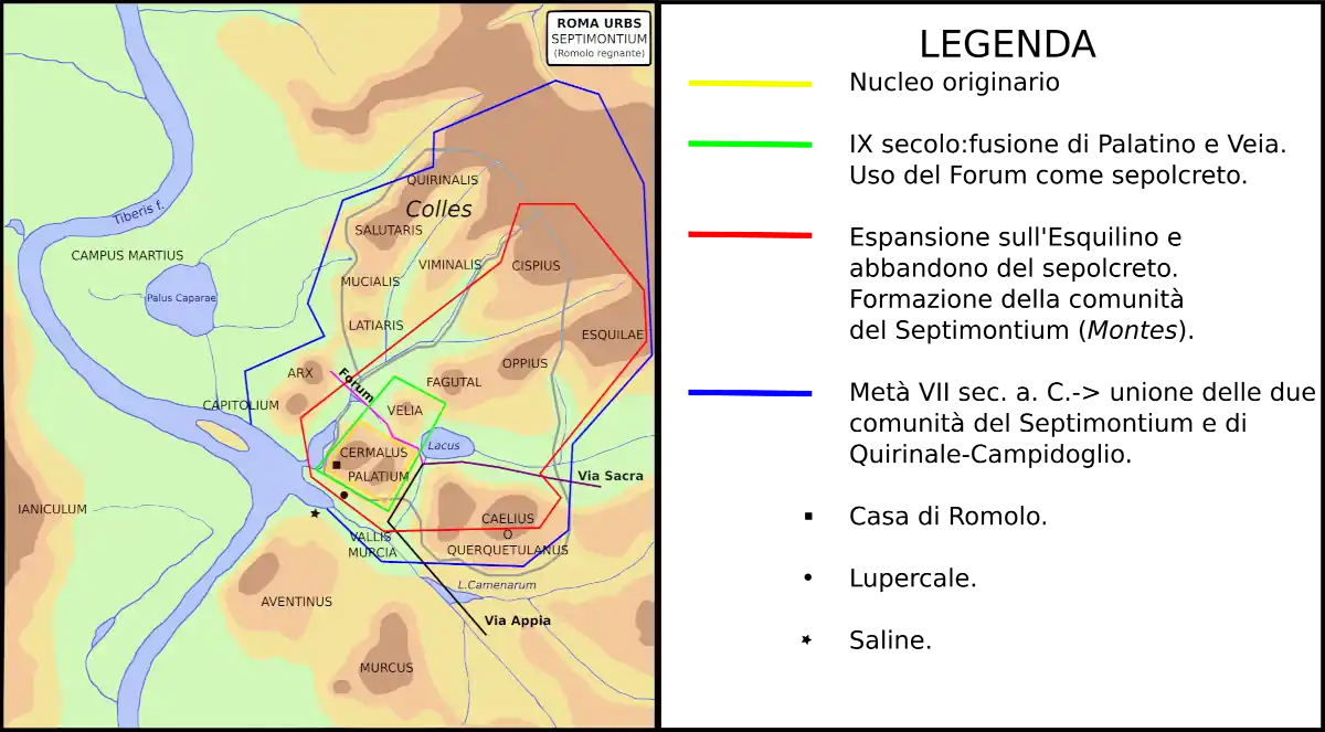 L’unione della comunità del Septimontium con quella degli altri due colli si verificò successivamente, quando nel Foro scomparvero le tombe e cominciarono a delinearsi le prime capanne, verso la metà del VII secolo a.C.